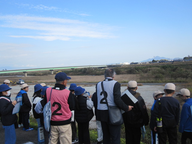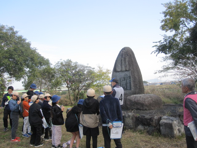 4年生が野洲川フィールドワークにでかけました。守山市の「まるごと活性化Cプロジェクト」の部会員の方から、野洲川改修工事に伴う集団移転についての話やかつて頻発していた水害などの説明を聞き、野洲川とその歴史について理解を深めました。子どもたちに向けてわかりやすく、熱く語ってくださりありがとうございました。